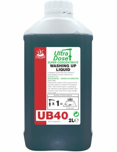 A thick, green liquid with a high foam level, UB40 is designed to be used through the Clover Chemicals Ultra Dose system for washing up by hand. Suitable for use on all crockery, cutlery, glassware and utensils.
