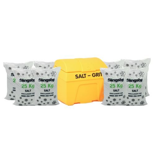 - Bag Size kg: 25. Capacity L: 200. Consists of: 200l grit bin and 8 x 25kg of high purity de-icing salt. Height mm: 725. Includes: Grit bin and 8 x 25kg of high purity white de-icing salt. Length mm: 850. Material: Polythene. Product Type: Salt & grit kits. Type: Supplied with high purity white de-icing salt. Width mm: 505.