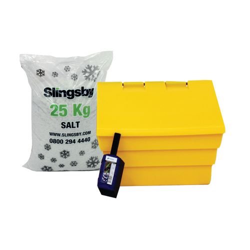 - Capacity kg: 50. Colour: Yellow. Consists of: 50 litre grit bin, 1 x 25kg white salt and 1 x hand spreader/shaker. Height mm: 450. Includes: Grit bin plus 1 x 25kg bag of white de-icing salt. Length mm: 420. Material: Salt and polyethylene. Min. Order Quantity: 1. No. of Bags: 1. Product Type: Salt & grit kits. Total Weight kg: 32.1. Type: Salt and grit bin kit. Weight kg: 32.1. Width mm: 590.