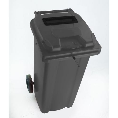 Capacity L: 140. Colour: Grey. Depth mm: 555. Height mm: 1070. Material: UV stabilised polyethylene. Product Type: Two wheel bins. Type: Confidential waste 2 wheeled bins with slot and lid lock. Width mm: 480.