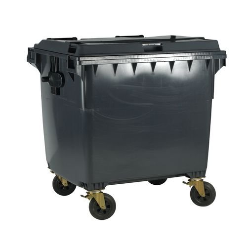 Capacity L: 1100. Colour: Grey. Depth mm: 1200. Height mm: 1450. Material: UV stabilised polyethylene. No. of Wheels: 4. Product Type: Four wheel bins. Type: With flat lid. Weight kg: 67. Width mm: 1400.