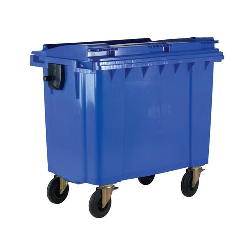 - This 1100 litre capacity outdoor bin is perfect for busy commercial environments. Its UV stabilised polyethylene structure ensures that this product has better resistance to UV damage than unmodified high density polyethylene. Its bright blue appearance makes it easily identifiable in busy commercial waste bin areas.