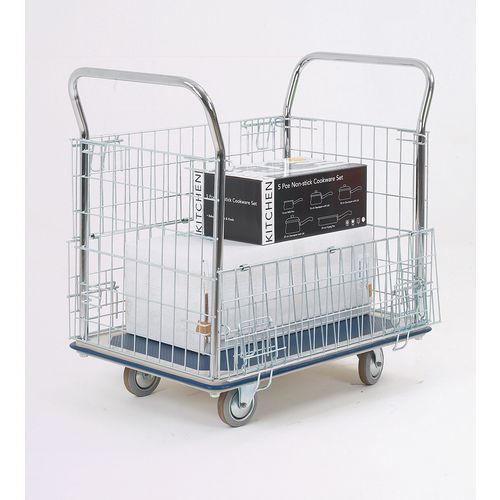 Handle any goods with care using the highly durable steel platform truck. Equipped with protective chrome plated mesh panels, the truck ensures safe storage during transit as well as delivery. Set upon two fixed and two swivel non-marking rubber tyred wheels, this design contributes to smooth steering over a multitude of surfaces