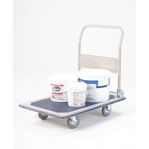 Capacity kg: 300. Capacity kg: 370. Finish: Painted. Length mm: 940. Material: Steel. No. of Wheels: 4. Platform Length mm: 940. Product Type: Manual. Type: Folding handle. Wheel Diameter mm: 125. Wheel Type: 2 fixed and 2 swivel solid polyurethane castors. Wheel Type: Polyurethane. Width mm: 615.