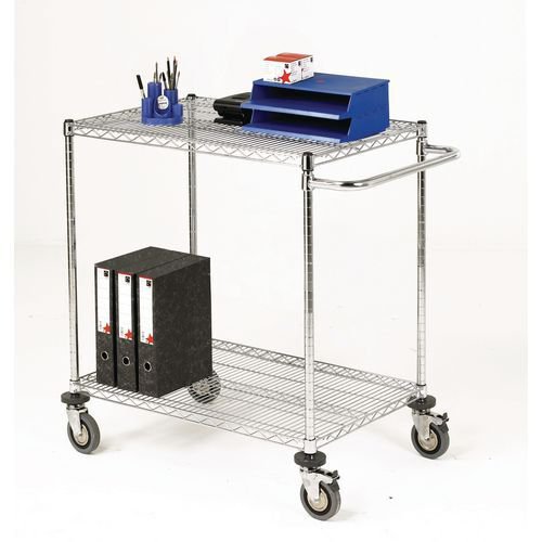 Capacity kg: 240. Depth mm: 610. Dimensions: H x D x L mm: 965 x 610 x 1219. Finish: Zinc chromate. Finish: Zinc plated. Height mm: 965. Length mm: 1219. No. of Shelves: 2. No. of Wheels: 4. Product Type: Manual. Wheel Diameter mm: 125. Wheel Type: Rubber tyred braked. Wheel Type: Rubber tyred swivel, 2 fitted with brakes.
