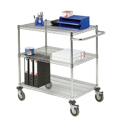 Capacity kg: 240. Depth mm: 457. Dimensions: H x D x L mm: 965 x 457 x 1219. Finish: Zinc chromate. Finish: Zinc plated. Height mm: 965. Length mm: 1219. No. of Shelves: 3. No. of Wheels: 4. Product Type: Manual. Wheel Diameter mm: 125. Wheel Type: Rubber tyred braked. Wheel Type: Rubber tyred swivel, 2 fitted with brakes.
