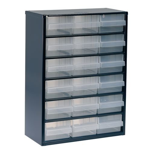 Colour: Clear. Colour: Dark grey. Depth mm: 150. Dimensions: H x W x D mm: 420 x 307 x 150. Drawer Colour: Clear. Drawer Material: Polycarbonate. Drawer Type: C. Finish: Stove enamelled. Frame Material: Strong steel. Height mm: 420. No. of Drawers: 18. Type: High cabinet. Width mm: 307.