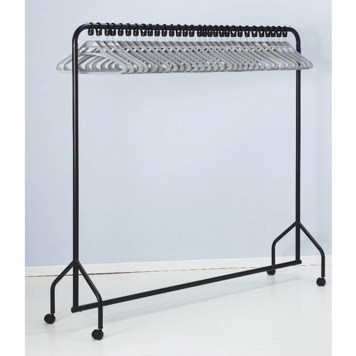 Colour: Black. Depth mm: 500. Dimensions: H x D x L mm: 1730 x 500 x 1830. Finish: Epoxy coated. Finish: Painted steel. Height mm: 1730. Includes: with 30 grey hangers. Length mm: 1830. Material: Steel tube. Product Type: Rails. Type: Rail with 30 grey hangers.