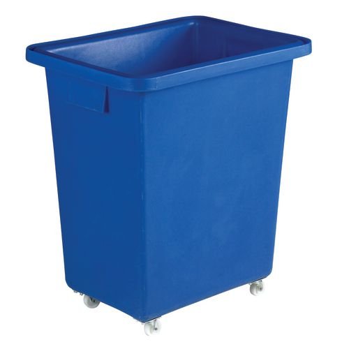 Capacity L: 125. Colour: Blue. Colour: Royal blue. Dimensions: H x W x L mm: 770 x 500 x 680. External Height mm: 770. External Length mm: 680. External Width mm: 500. Height mm: 770. Internal Height mm: 700. Internal Length mm: 580. Internal Width mm: 410. Length mm: 680. Material: Medium density polyethylene. No. of Wheels: 4. Product Type: Without lid. Wheel Diameter mm: 51. Wheel Type: Swivel nylon castors. Width mm: 500.