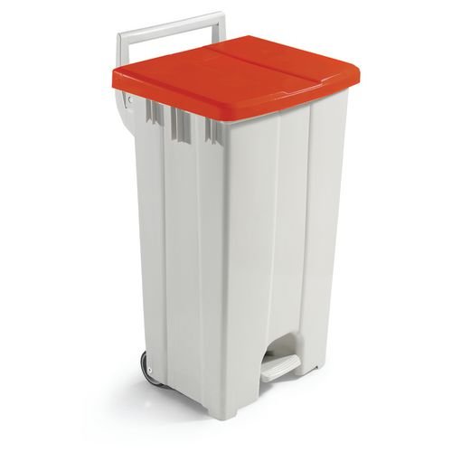 Body Colour: White. Capacity L: 90. Depth mm: 465. Dimensions: H x W x D mm: 920 x 510 x 465. Height mm: 920. Lid Colour: Red. Type: Mobile, pedal. Width mm: 510.