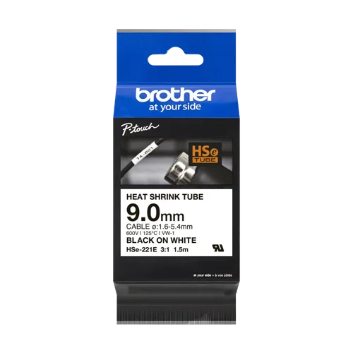 - This 9mm black on white HSe-221E tape cassette has been designed specifically for the marking and identifying of cables, fibre and wires with an outside diameter of 1.6mm-5.4mm.