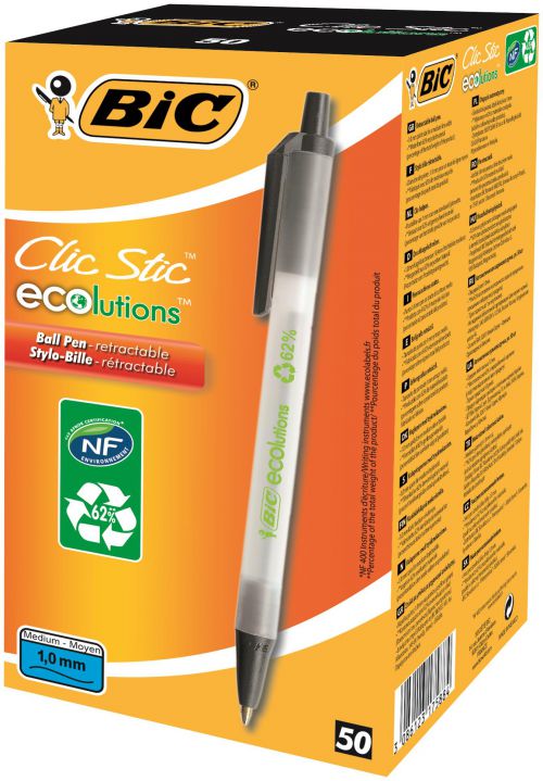 - BIC ECOlutions Clic Stic is a retractable medium point ball pen made from 62% recycled material. This pen is a perfect addition to any pencil case or desk with its slim transparent barrel. The 1.0mm tip gives a line width of 0.32mm and has been accredited with an NF environmental status.